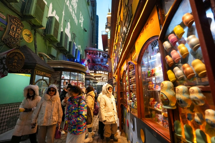 2025年12月16日,人们在哈尔滨中央大街肖克庭院景点参观游览。中央大街始建于1898年,全长1450米,由87万多块“面包石”铺成,被誉为“万国建筑博物馆”。