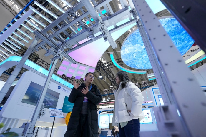 2026年1月6日,在2026哈尔滨国际冰雪经济博览会展会现场,参会嘉宾(左)为参观者介绍智能大型冰雕自动化搭建机器人。本届博览会旨在通过成果展示、产业交流与投资合作,展现“冰雪+经济”“冰雪+科技”等融合发展成果,为全球投资者提供市场机遇。