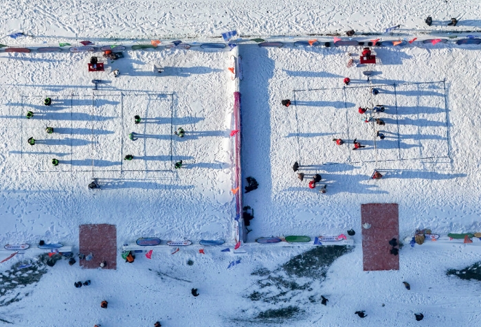 2025年12月25日,人们在第八届哈尔滨松花江冰雪嘉年华园区内体验冰上排球(无人机照片)。本届冰雪嘉年华推出近60项特色项目,为市民与游客打造多样化的冰雪体验。