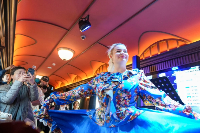 2025年12月6日,演员在黑龙江省“伊春号”旅游专列车厢中表演。当日,“伊春号”旅游专列投入试运行,40余名受邀体验的游客乘专列由哈尔滨站出发,去往亚布力滑雪旅游度假区。2025年以来,中国铁路哈尔滨局集团有限公司陆续开行了多趟旅游列车,将特色体验、民俗展示、定制化服务等进行融合,满足游客需求,服务旅客出行。
