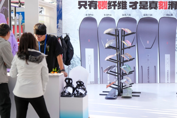2026年1月6日,在2026哈尔滨国际冰雪经济博览会展会现场,参观者咨询一款碳纤维滑雪板性能。