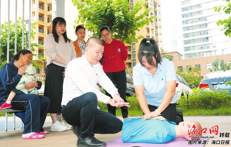 在更贴近生活的社区场景中,“宣讲”以更实操的形式进行。“小区有医生吗?楼下有人昏倒了!”“我马上到!”2024年3月,美兰区美舍仕家小区内一位老人突发晕厥,同住小区的海口市第三人民医院呼吸与危重症医学科主治医师符征高火速施救,并协助拨打120、联系家属,帮助老人转危为安。这次紧急救援也让他萌生了一个想法:“如果能成立一支志愿急救队,就能在突发状况时提供救援,为居民生命安全增添保障。”