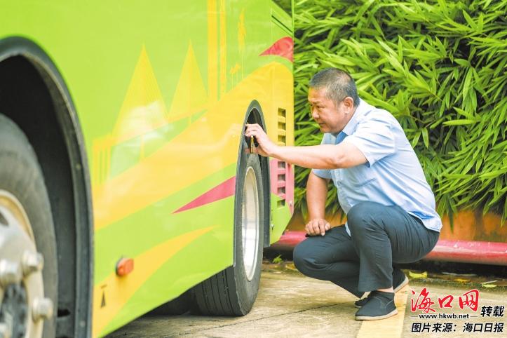 海南省道德模范、海口市公共交通有限公司线管员刘筱杰正在检查车辆轮胎。记者 苏弼坤 摄