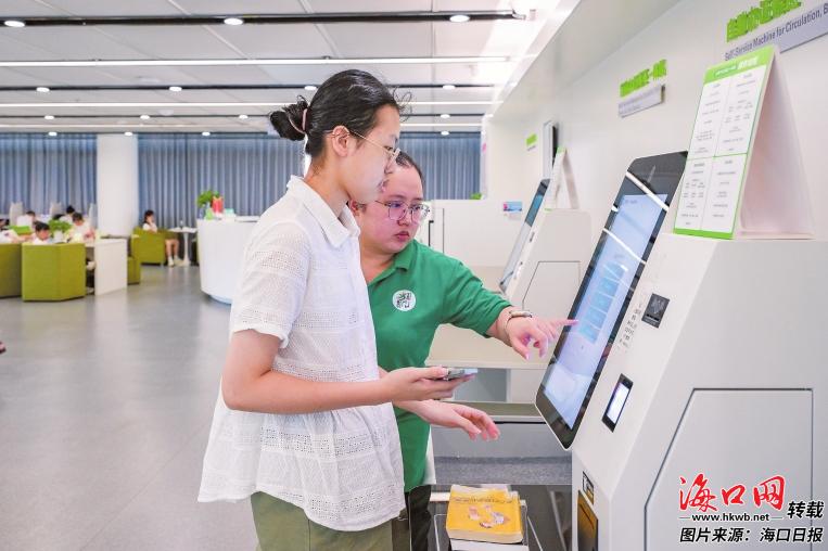 在龙华区图书馆,读者正使用“海易办”APP中的“金椰分”办理图书借阅。 记者 苏弼坤 摄