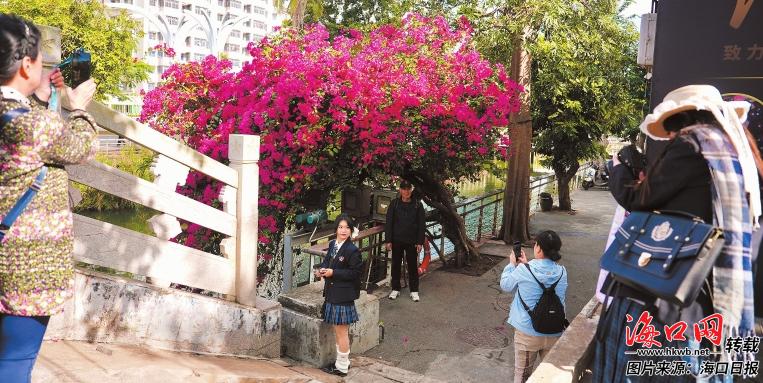 近日,海口大同桥的三角梅迎来盛花期,玫红色的花枝繁茂垂落,织就出壮观的“花瀑”景观,成为椰城冬日里的一抹亮色。