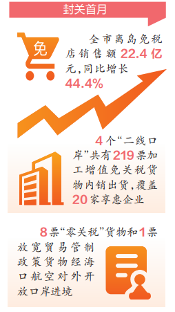 1月18日,海南自由贸易港封关运作迎来“满月”。一个月以来,海口4个“二线口岸”平稳有序运行,应急体制机制建立健全,信息化系统稳定高效,海关监管设施设备零故障,封关运作实现良好开局。封关运作首月,海口多项工作交出亮眼成绩单,其中,离岛免税店销售额22.4亿元,同比增长44.4%,创同期新高,持续擦亮海南旅游消费的“金字招牌”。