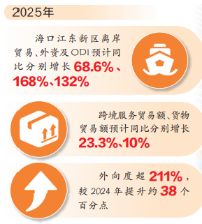 数据印证发展活力。去年江东新区离岸贸易、外资及ODI预计同比分别增长68.6%、168%、132%;跨境服务贸易额、货物贸易额预计同比分别增长 23.3%、10%;外向度超 211%,较 2024 年提升约38个百分点。