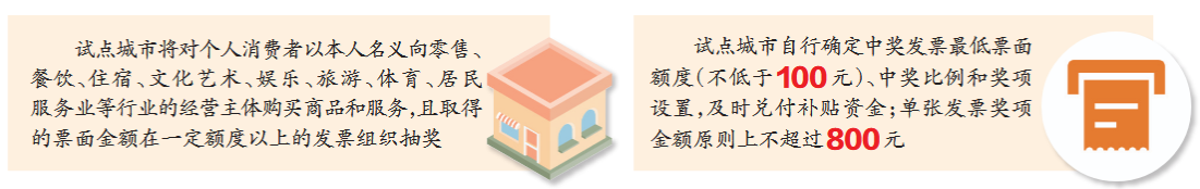 根据此前通知,试点城市将对个人消费者以本人名义向零售、餐饮、住宿、文化艺术、娱乐、旅游、体育、居民服务业等行业的经营主体购买商品和服务,且取得的票面金额在一定额度以上的发票组织抽奖。试点城市自行确定中奖发票最低票面额度(不低于100元)、中奖比例和奖项设置,及时兑付补贴资金。单张发票奖项金额原则上不超过800元。