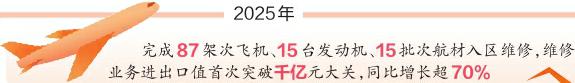 记者从海口海关获悉,2025年海口空港综保区完成87架次飞机、15台发动机、15批次航材入区维修,维修业务进出口值首次突破千亿元大关,同比增长超70%。