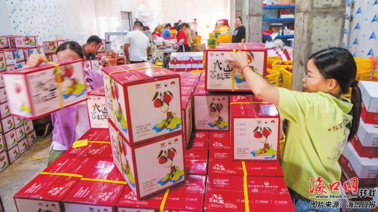 火山荔枝收获季,在海口火山荔枝金农分拣中心,工作人员将火山荔枝王打包装箱,并陆续发往各地市场。记者 石中华 摄