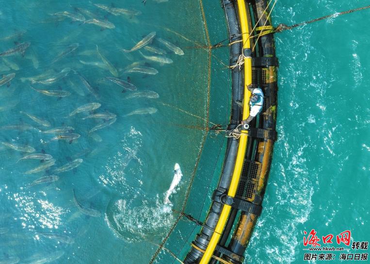 海口市秀英区荣山寮村西侧海域,蔚蓝的海面上漂浮着深水网箱,里面养殖的军曹鱼长势喜人。 记者 石中华 摄