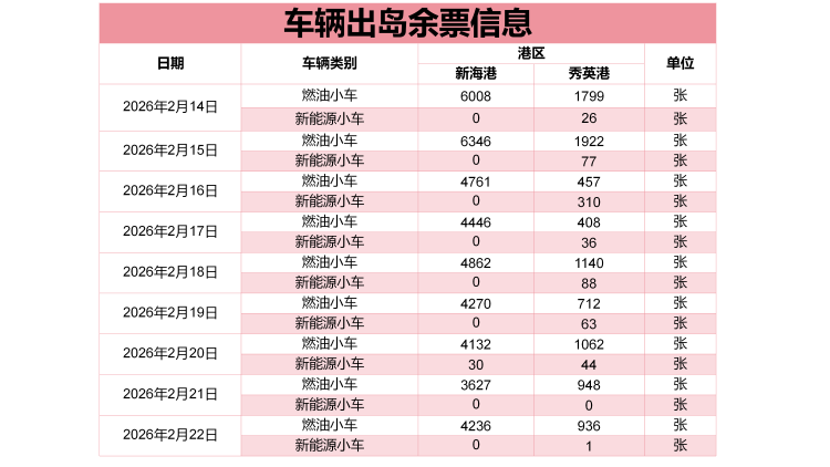 目前,春运40天内的新能源车、小车各时段的进出岛方向余票量充足,请有过海需求的旅客提前购买好往返船票,以免耽误行程。