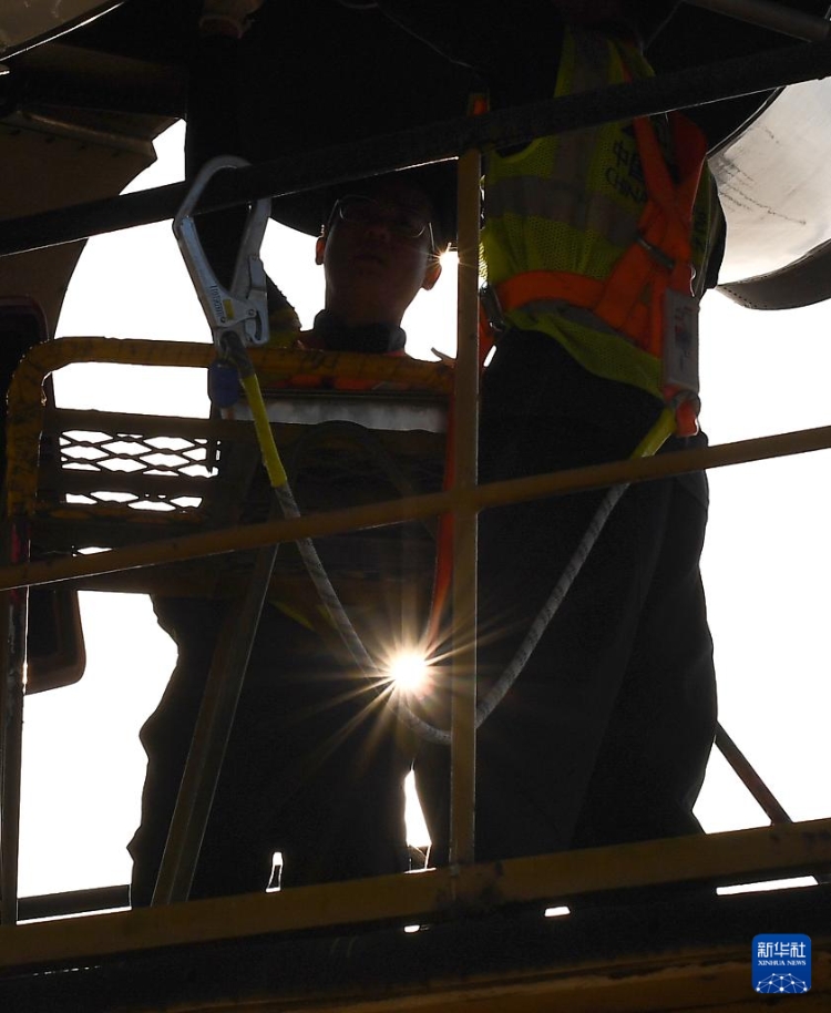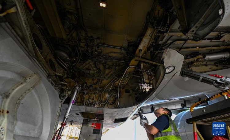 1月29日,海口美兰国际机场停机坪上,南航工程技术分公司机务工程师在对飞机进行深度检查。新华社记者 杨冠宇 摄
