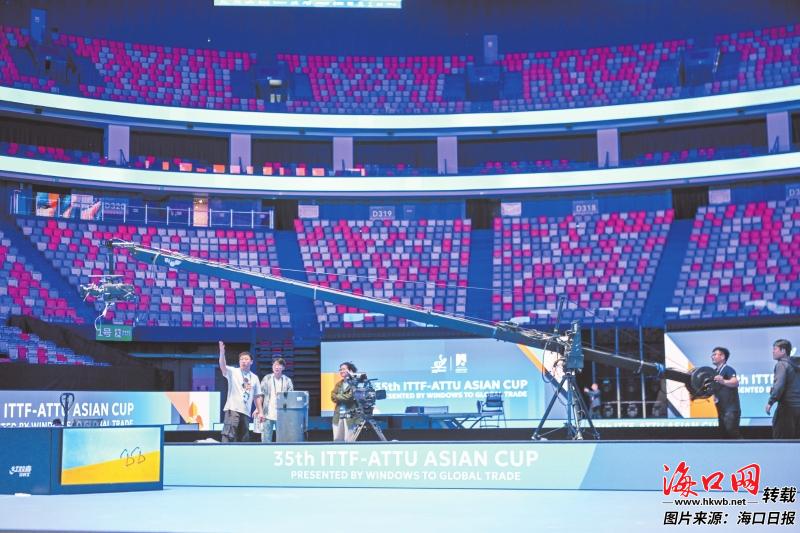 第35届国际乒联—亚乒联盟亚洲杯比赛场馆布置基本完成,现场工作人员正在调整摄像设备。记者苏弼坤 实习生陈新锐 摄