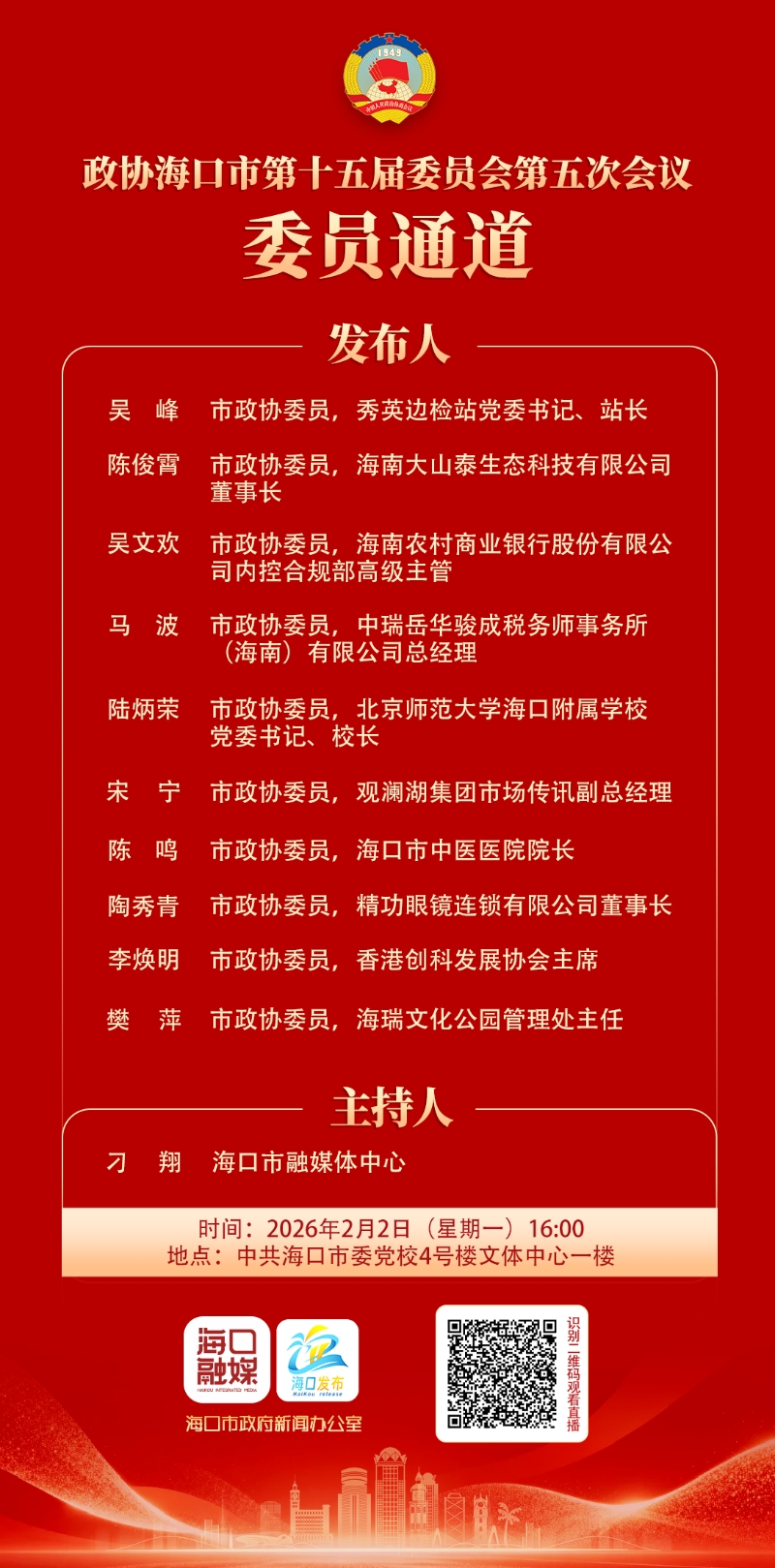 2026年2月2日16:00,政协海口市第十五届委员会第五次会议“委员通道”集体采访活动将在中共海口市委党校举行,邀请市政协委员,秀英边检站党委书记、站长吴峰;市政协委员,海南大山泰生态科技有限公司董事长陈俊霄;市政协委员,海南农村商业银行股份有限公司内控合规部高级主管吴文欢;市政协委员,中瑞岳华骏成税务师事务所(海南)有限公司总经理马波;市政协委员,北京师范大学海口附属学校党委书记、校长陆炳荣;市政协委员,观澜湖集团市场传讯副总经理宋宁;市政协委员,海口市中医医院院长陈鸣;市政协委员,精功眼镜连锁有限公司董事长陶秀青;市政协委员,香港创科发展协会主席李焕明;市政协委员,海瑞文化公园管理处主任樊萍回答记者提问。