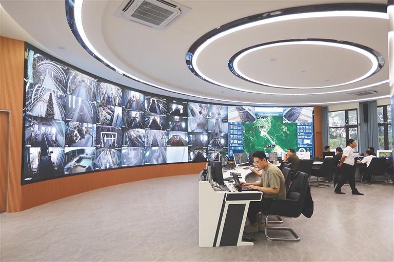 走进中控室,大屏幕上可见矿山的各类实时数据和模拟三维动画。在这里,无人机高空巡检、智能机器人长皮带廊道巡检,通过AI定时定期定路线,以视觉、红外温控、声控等多种方式,加强生产线及厂区的安全隐患排查,并实时在中控室显示情况,故障识别准确率达99%。