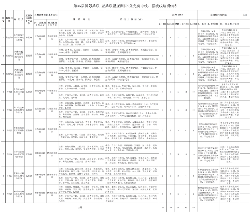 2月4日至8日,第35届国际乒联-亚乒联盟亚洲杯将在海口五源河体育馆举办。为保障赛事期间海口道路交通安全畅通,有效缓解长滨路及周边区域交通压力,海口公交通过开通9条免费公交专线、加密常规公交发班密度、动态调度出租车运力等方式,全力满足球迷的公共交通出行需求。