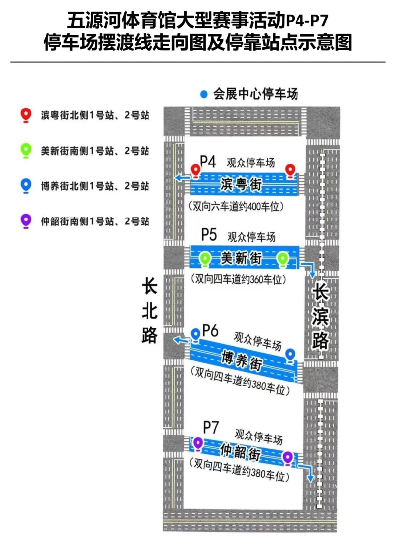 同时,在星茂购物中心、P4和P5停车场、P6和P7停车场开通3条免费公交摆渡线,方便球迷就近停车,摆渡前往场馆。