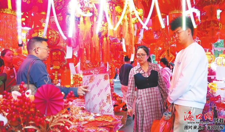 2月9日,春节临近,海口博爱南路已然化身一片喜庆的红色海洋。沿街商铺挂满了红灯笼、中国结与马年主题挂饰,琳琅满目的春联将街巷装点得熠熠生辉,浓郁的年味扑面而来,吸引了大批市民前来选购。