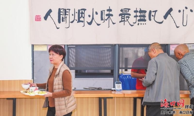 在琼山区国兴街道综合养老服务中心,长者取餐用餐,氛围温馨。