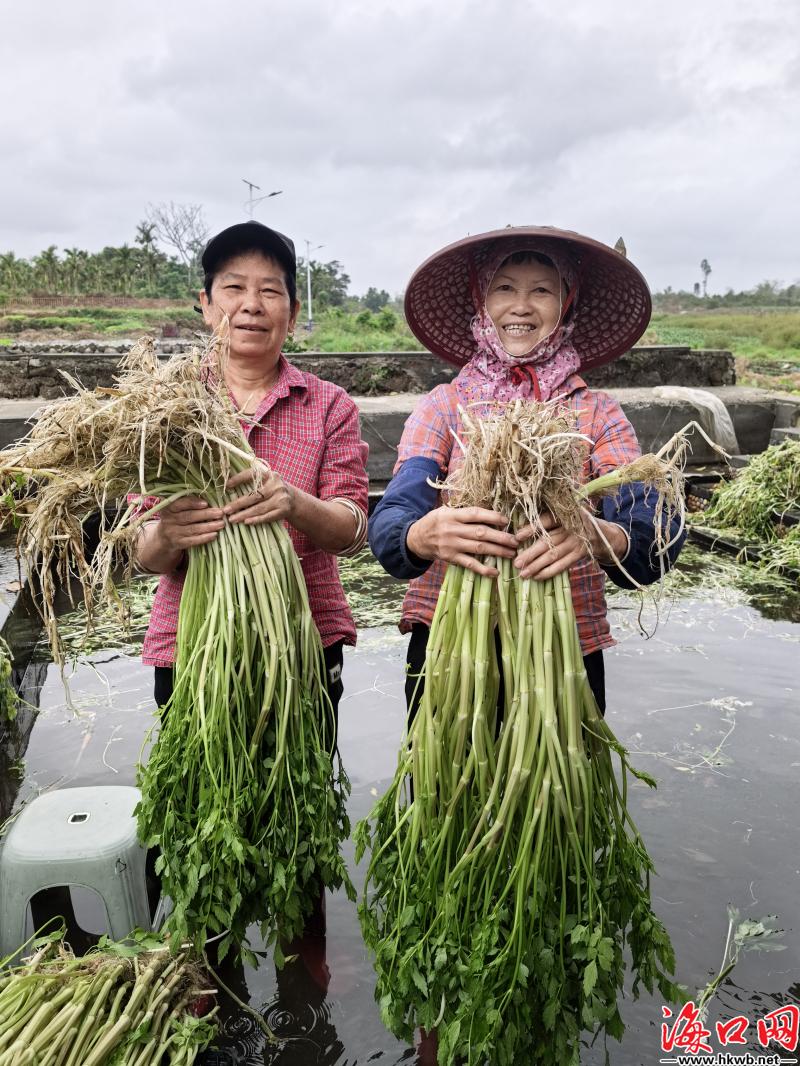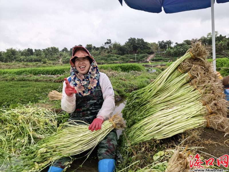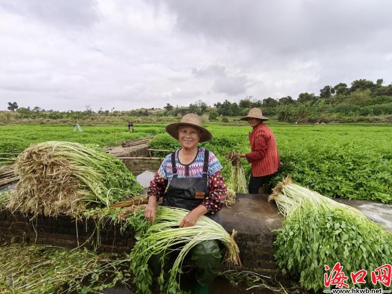 在岭南村,依托连片的冷泉水面和传统种植基础,镇里引导村民成立合作社,规模化发展冷泉水芹、冷泉丝瓜等瓜菜产业,全村冬季瓜菜面积近4000亩。其中,冷泉水芹种植面积近300亩,年产值约800万元,成为海口冬季蔬菜市场的一块“金字招牌”。