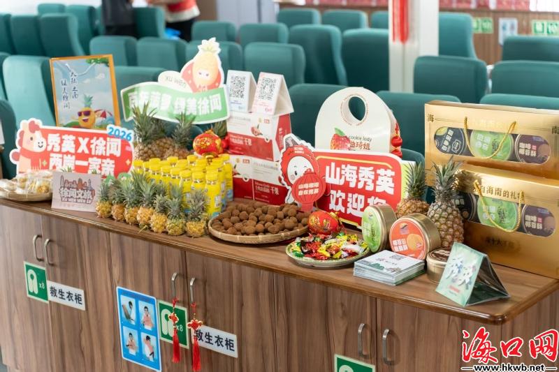 高挂的红灯笼、精美的窗花与喜庆的主题背景板相映成趣,浓浓的年味扑面而来。节目巧妙融合两地民俗与新春元素,将客舱变成了欢乐的海上舞台,掌声与笑语此起彼伏,交织成琼粤两地同庆新春的温馨乐章。暖心服务,定格旅途小美满这场旅程,不仅有听觉与视觉的盛宴,更有触手可及的温暖与惊喜。活动现场设置了特色产品品鉴区,秀英椰子糖的香甜、荔枝干的软糯、徐闻菠萝果汁的清冽,让旅客们“一站式”品尝到地道的琼粤风味。