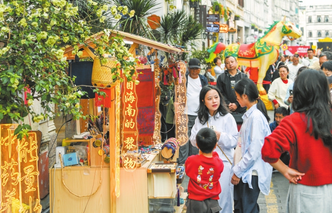 在海口骑楼老街,独具特色的黎锦文化摊位,吸引不少市民游客驻足欣赏。记者 康登淋 摄