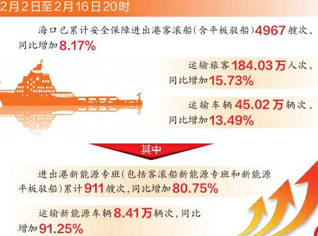 2月16日,记者从海口海事局了解到,琼州海峡南北两岸客滚运输船舶运力充足、通行顺畅。2月2日,2026年春运正式开启,截至2月16日20时,海口已累计安全保障进出港客滚船(含平板驳船)4967艘次,运输旅客184.03万人次、车辆45.02万辆次,同比分别增加8.17%、15.73%、13.49%。其中,进出港新能源专班(包括客滚船新能源专班和新能源平板驳船)累计911艘次,同比增加80.75%;累计运输新能源车辆8.41万辆次,同比增加91.25%。