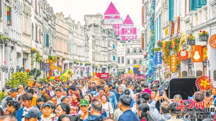 2月18日,海口骑楼老街热闹非凡,人们结伴逛市集、品美食、赏民俗,在浓浓烟火气中欢度春节假期。 记者 康登淋 摄