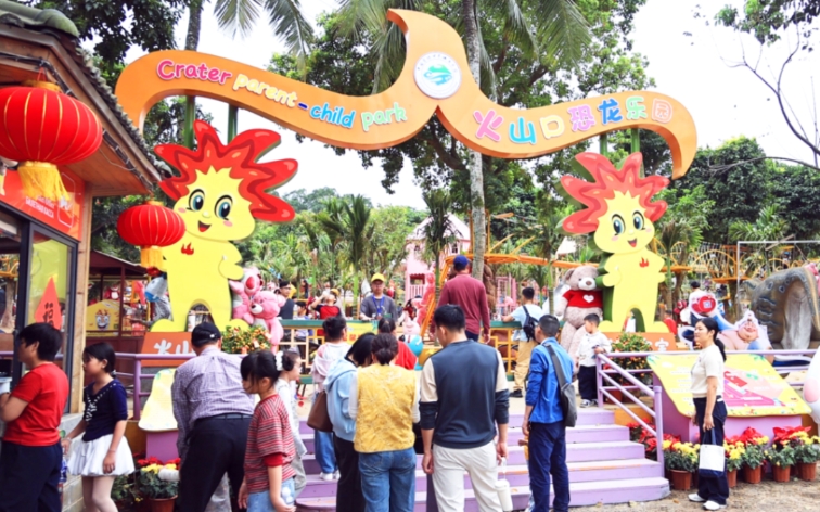 孩子们在恐龙乐园里嬉笑奔跑,为园区增添了更多欢声笑语。火山口酒家推出的琼粤风味美食备受家庭游客青睐,一杯地道的火山阿拉比卡咖啡,则让许多人放慢脚步,在绿荫下享受悠闲的假日时光。据悉,此次民俗歌舞表演将持续至正月初五,每天在园区环廊广场上演两场,为市民游客奉上充满地域特色的文化年味。
