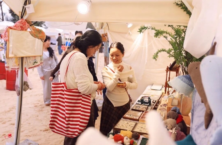 一旁的Land Cross 难得垮丝滨海文化运动俱乐部里,“行走的鱼”艺术市集汇聚了手作饰品、非遗民俗工艺等多种业态,让人们在赶集中感受创意的温度与烟火气。据统计,荣山寮村除夕至初一游客接待量同比增长显著,成为秀英滨海游的一匹黑马。