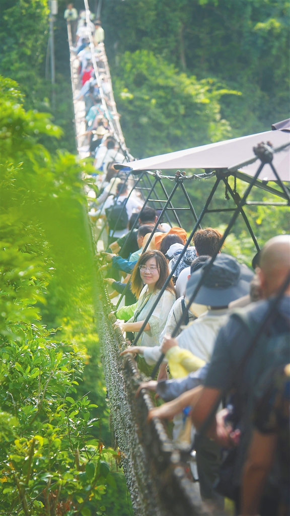 2月19日,中外游客在三亚亚龙湾热带天堂森林旅游区游玩打卡,漫步在雨林中赏花观景,登高望远。通讯员 黄庆优 摄