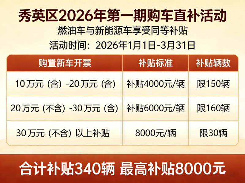 2026年第一季度,秀英区拿出“真金白银”为汽车消费添柴。根据“秀英区2026年第一期购车直补”政策,在秀英区内购车的个人消费者,最高可享8000元购车直补,覆盖10万元至30万元以上多个价格区间,共计340个补贴名额,燃油车与新能源车享受同等补贴标准。在政府补贴基础上,各大车企积极响应,推出形式多样的新春促销,形成“政府补贴+企业让利”的双重叠加效应,通过落实各项优惠举措,努力激发市场活力。