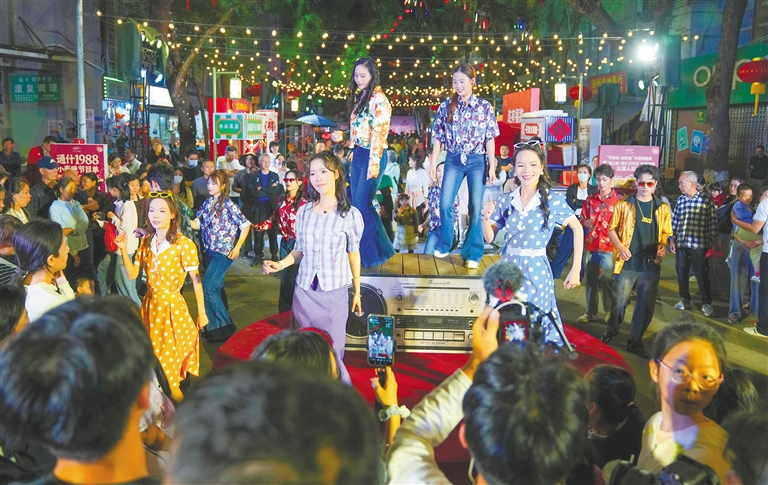 2月20日,五指山市“通什1988”全景沉浸式街区热闹非凡,具有年代感的歌舞类节目受到游客欢迎。海南日报全媒体记者李天平摄
