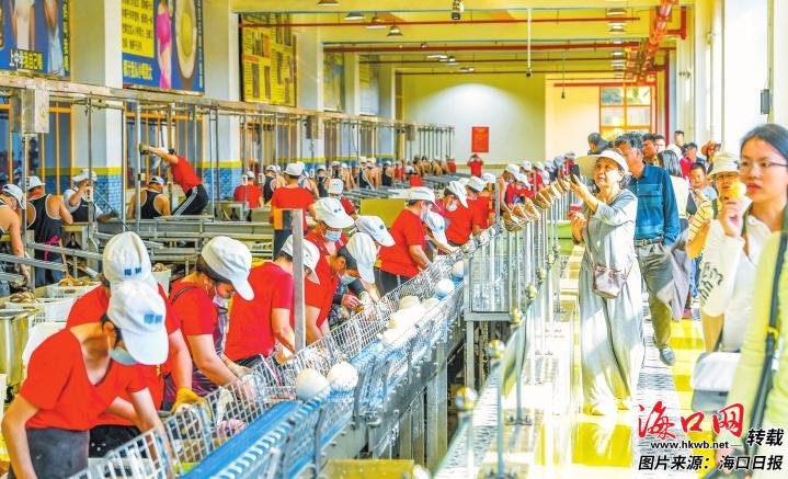 在原料车间,浓郁醇厚的椰香扑面而来,工人们熟练地对新鲜椰子进行削皮、切割,鲜嫩饱满的椰子顺着流水线奔赴下一道工序,现场还贴心设置了品尝区,市民游客可免费品尝刚切割下来的椰宝与椰肉,一口清甜直达心底,真切感受“海口美味”的本真风味。