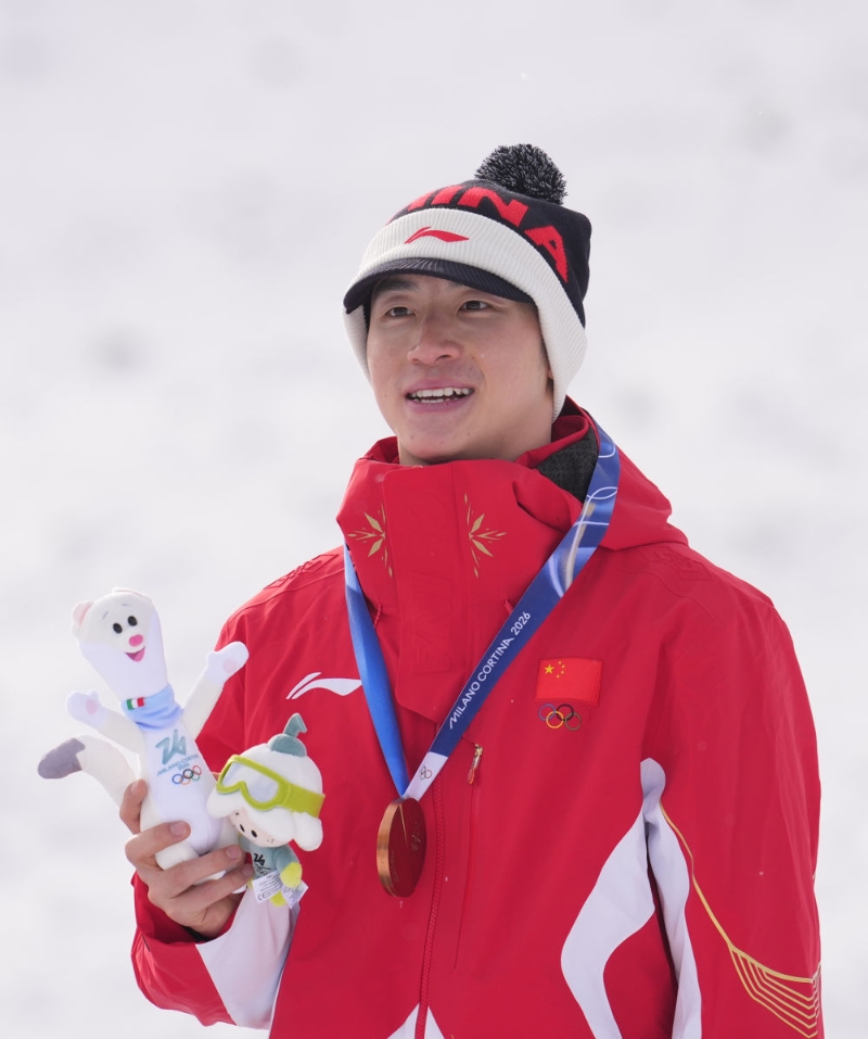 2月20日,李天马在颁奖仪式上。当地时间2月20日,在意大利利维尼奥举行的米兰-科尔蒂纳冬奥会自由式滑雪男子空中技巧决赛中,中国选手李天马获得铜牌。新华社记者 胡超 摄邵琪