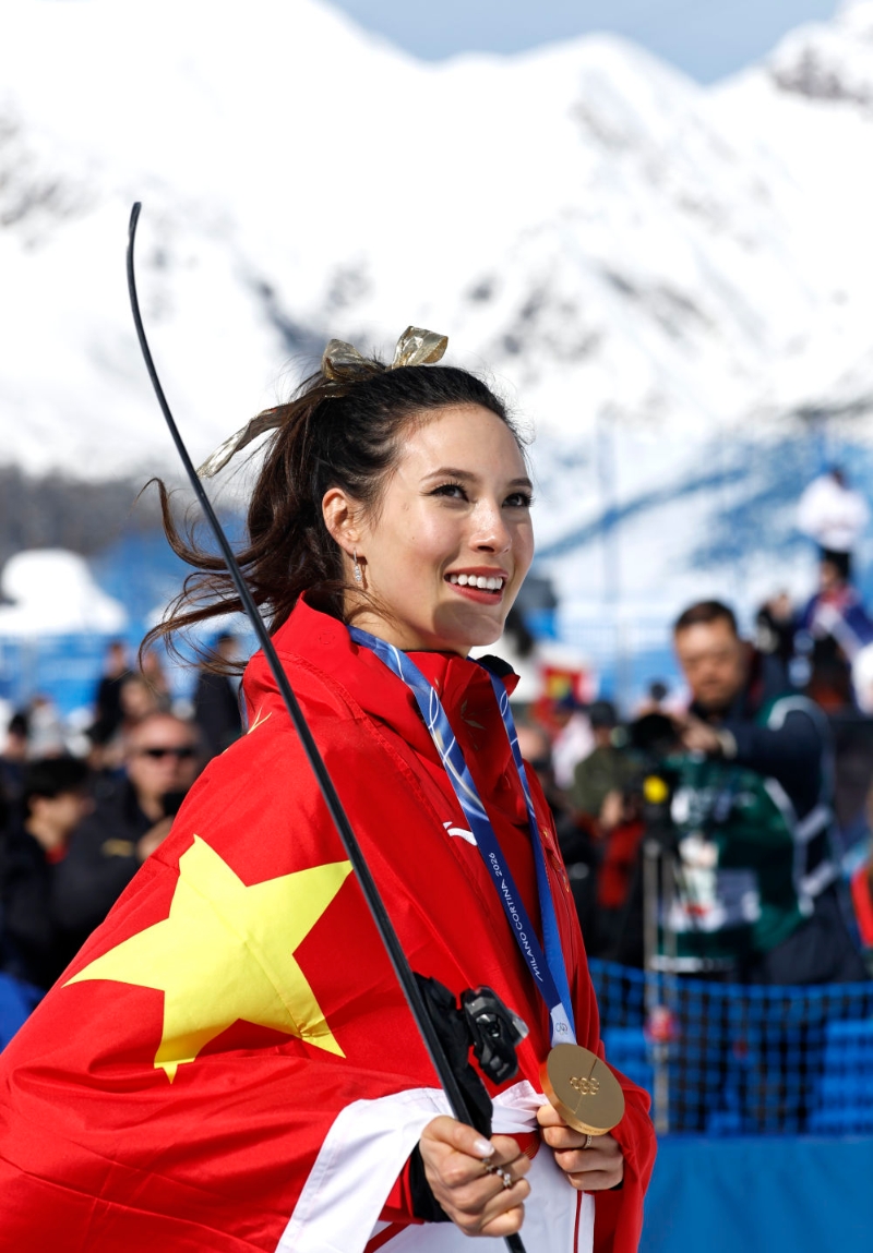2月22日,谷爱凌在颁奖仪式后。当地时间2月22日,在意大利利维尼奥举行的米兰-科尔蒂纳冬奥会自由式滑雪女子U型场地技巧决赛中,中国选手谷爱凌获得冠军。新华社记者 王鹏 摄王心迪