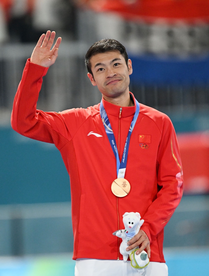 2月11日,宁忠岩在颁奖仪式上。当地时间2月11日,米兰-科尔蒂纳冬奥会速度滑冰男子1000米决赛在意大利米兰举行,中国选手宁忠岩获得铜牌。新华社记者 武巍 摄苏翊鸣