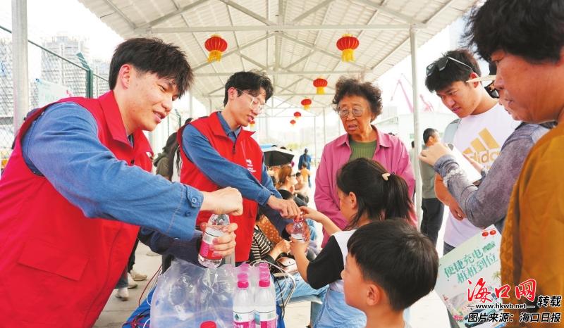 2月23日,黄华杨(左一)和同事们在秀英港的电力便民服务点为过往旅客送水。记者 杨忠凯 摄