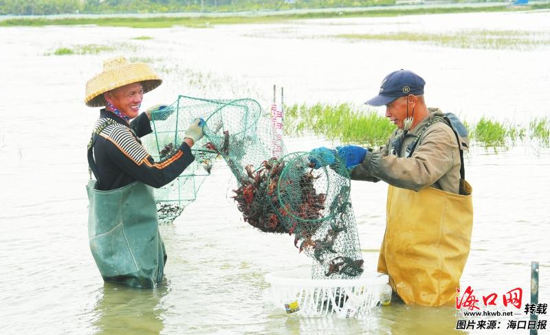 日前,美兰区三江镇的稻渔综合种养试验区一派繁忙景象。工作人员身穿齐胸防水裤在稻田里打捞小龙虾。