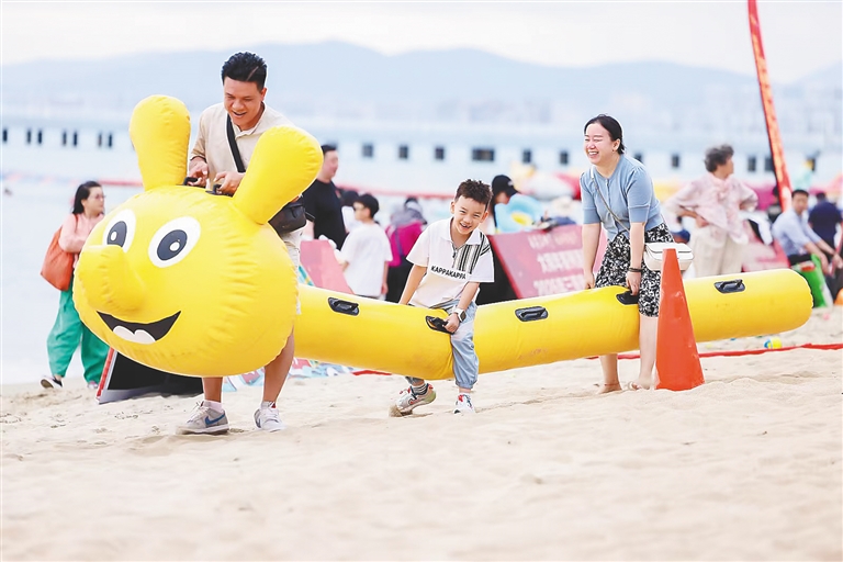 2月22日,游客在三亚湾海滩体验沙滩趣味活动项目。2月22日至23日,2026年三亚市全民健身大拜年沙滩运动嘉年华活动在三亚湾海月广场沙滩举行,沙滩椰子保龄球、沙滩障碍挑战赛等十大体验项目吸引众多市民游客踊跃参与。三亚市全民健身大拜年已连续举办多年,是广受市民游客欢迎的春节系列活动之一。