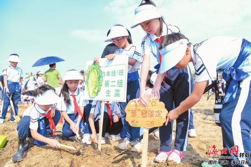 在美兰区海虫草现代产业园内的盐碱地上,海口市滨海第九小学新埠学校的学生们协作种下生菜、空心菜等作物。记者 苏弼坤 摄