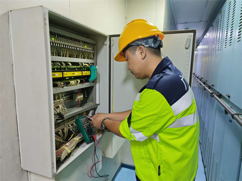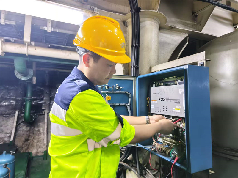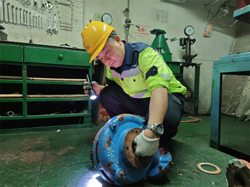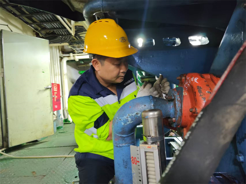 图为吴清亮检查、抢修设备时的场景。(海口机辆轮渡段船管中心供图)
