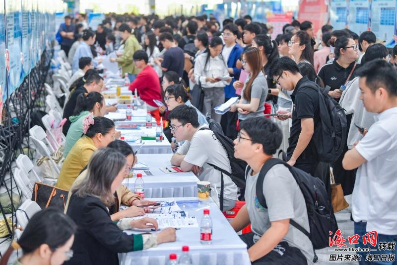 “情系椰城,‘职’等你来”。对接会现场,海口专区人气火爆,成为求职者关注的焦点。84家用人单位展位依次排开,共提供678个优质岗位,总需求达1897人。各展位前,求职者排起了长龙。