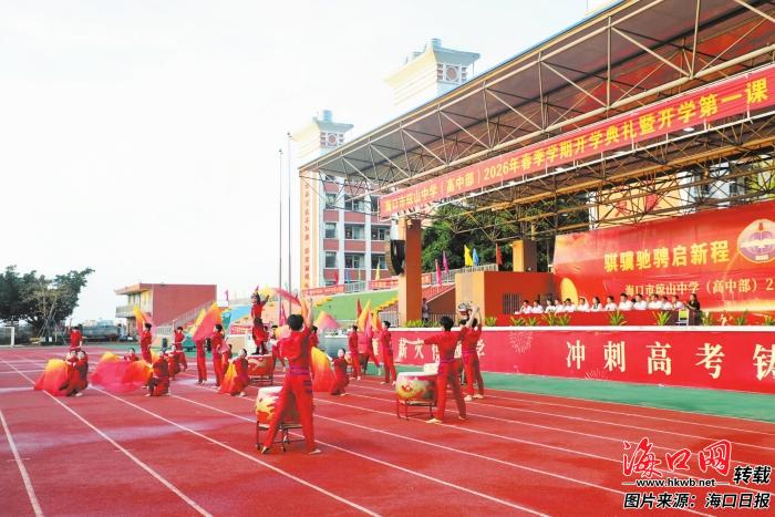 3月2日,海口市琼山中学(高中部)舞蹈团的学生们在“开学第一课”活动上演绎文艺节目《骐骥驰骋》,以振奋的鼓点鼓舞在场师生。 (学校供图)