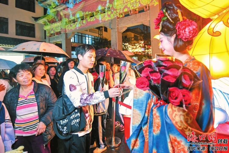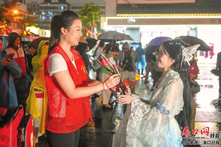 3月3日,在海口府城,游客与志愿者互换鲜花,传递美好祝愿。记者 苏弼坤 摄