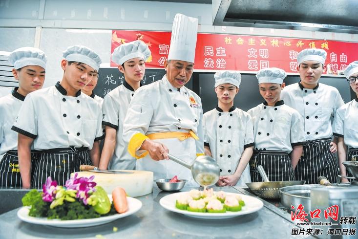 碧绿牡丹虾、花生炒肉丁……在位于海口技师学院的省级技能大师周惟信工作室,通过现场实践教学方式,为学生们上了一堂生动的烹饪课。“希望能发挥个人专长,带动烹饪人才队伍建设,为海口旅游业提供坚实的人才支撑。”周惟信说。