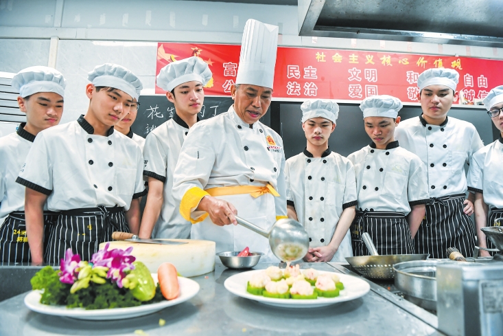 3月4日,在位于海口技师学院的省级技能大师周惟信工作室,周惟信(中)正在手把手教学生做菜。