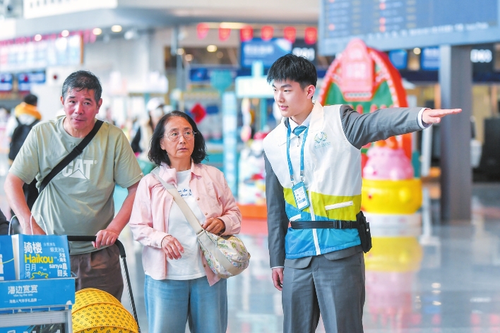 日前,在海口新海港,志愿者帮助旅客通过无障碍通道。