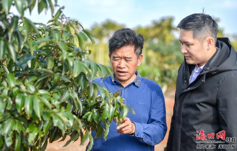 在琼山区三门坡镇一荔枝种植基地,种植户正在查看花期中的荔枝树。记者 苏弼坤 摄